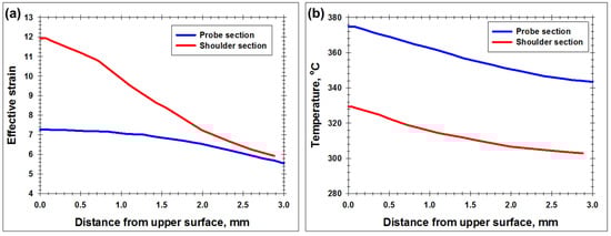 Typical through-thickness distributions of accumulated effective strain (a) and temperature (b) calculated at the weld centerline for the weld sections directly behind the tool probe and that behind the shoulder edge. Note: The distributions for the 500–380 weld is shown.
