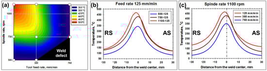 The combined effect of welding variables on the peak temperature (a), and typical effect of spindle rate (b) and the tool feed rate (c) on the temperature profiles calculated across the weld mid-thickness. In all cases, the temperature data were simulated for the weld section directly behind the tool probe. In (a), circles indicate the welding conditions for which the temperature data were actually simulated. In (b), the data for the welds produced at the feed rate of 125 mm/min are shown. In (c), the data for the welds produced at the spindle rate of 1100 rpm are shown.