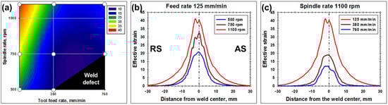 The strain distribution was also found to widen with either an increase in the spindle rate (Figure 7b) and/or a reduction in the feed rate (Figure 7c). Notably, the width of the deformation zone was predicted to span ~10–30 mm from the weld centerline (Figure 7b,c), thus significantly exceeding the radius of the tool shoulder (i.e., 6.25 mm). As expected, in all cases, the deformation zone on the RS was wider than that on the AS (Figure 7b,c).