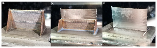 Figure 3 shows the 50 mm wall length sample before, during, and after machining. Figure 3a shows the as-printed thin wall with attached sacrificial support structures. Overbuilding from the additive process can be seen at the top of each support structure. Several deposition layers seen roughly halfway up the wall and near the top of the wall are also thicker than other layers. This was done manually during the printing process to assist in minimizing overbuilding during deposition. Figure 3b shows the same wall partially machined. Chatter can be observed near the center of the wall, and is less prevalent near the support structures on the wall. Figure 3c shows the fully machined thin wall. Surface finish can be seen to improve significantly halfway down the wall. It can also be noted that the surface finish at the top left of the wall changes between Figure 3b,c. This change is due to tool rubbing after the initial machining pass at the top of the wall and will be addressed in the results.