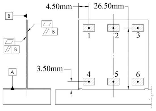 The thickness of each sample was measured in 6 different locations as shown in Figure 4. Each location was represented by a 2 mm by 3 mm patches on each side of the wall with 12 total patches. All patches were 2 mm away from nearby edges to avoid effects from the larger radial depth of cut (Rd) experiences when machining across sections of the wall with leftover support material. The perimeter of each patch was scanned using the CMM to fit a plane to each location. The plane was created using least square fitting to minimize influence from chatter on geometric results. The distance between two patches on opposite sides of the thin wall was then calculated from the center of each patch and parallel to the line that most closely approximates the perpendicular between the two planes. This method ensures that if the wall was not mounted perfectly perpendicular in the vice the thickness measured would not be influenced. The flatness and perpendicularity of each side of the wall relative to a datum “B” was also measured using a scanning path that encompasses the entire surface of the wall.