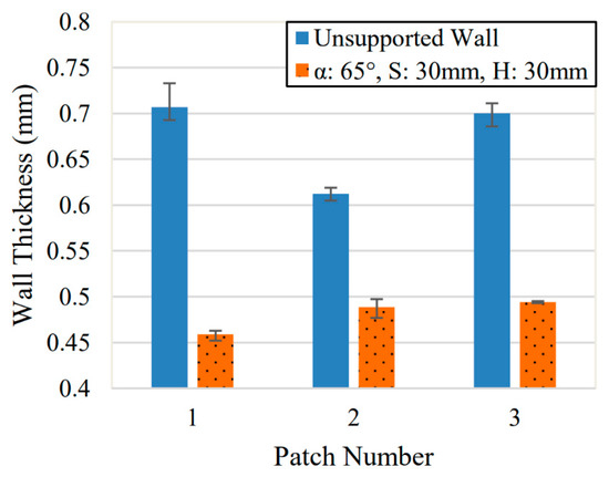 Comparisons between the unsupported and supported cases showed the largest change in values during the experiment. For these comparisons, both the supported and unsupported walls were 30 mm in length (S) and 30 mm in height (H). The supported walls used α = 65° supports which was the midpoint of the selected angle parameter range and wall length range. All samples were machined to a nominal thickness of T = 0.5 mm. Three samples were produced for each case, and their range of values is represented as error bars. All thicknesses are measured at a height of 26.5 mm. Across all samples the error and surface finished improved as height decreased, so this height was meant to serve as a worst-case result based on the highest point that could be measured using the CMM. The plotted value represents the average of the three samples for each parameter set. Figure 5 shows the comparison between these two sets of samples.