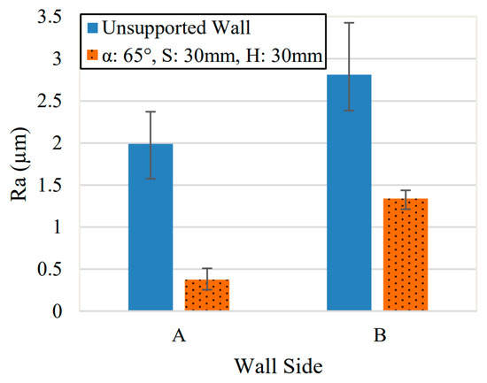 Figure 6 compares the surface roughness of the unsupported and 65° supported samples. Two comparisons are shown in the plot to represent the surface roughness on each side of the wall. This is done to illustrate that there is a significant difference in surface quality between the first and second thin wall machining pass for each machining step down, and is represented as Side A and Side B. Columns labelled A represent the surface finish for the side of the wall that was machined first for each Ad = 2 mm step down during machining. Similar, columns labelled B show the surface roughness for the side that was machined second for each step down.