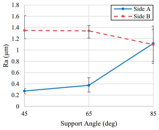 Effect of support angle (α) on surface roughness measured at a height of 27 mm and centered along length of thin wall, separated by Side A and Side B of each sample.