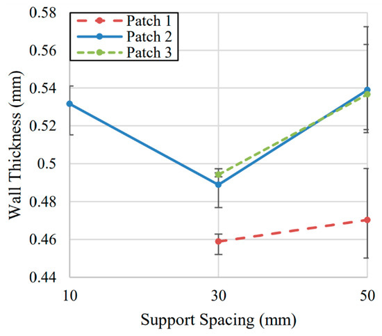 To evaluate the impact of different support spacing schemes, three samples were produced for each wall length of S = 10 mm, 30 mm, and 50 mm. The support angle was fixed at α = 65°, and the support was printed to the full height of the thin wall. Due to the length of the 10 mm sample, results are only shown for the center of each wall for the S = 10 mm sample as there was insufficient space along the length of the 10 mm sample to collect thickness measurements at multiple points.