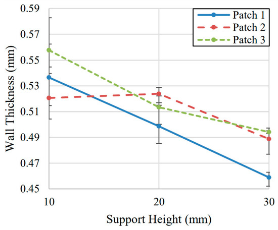 As with the other two parameters, height was evaluated at three different levels: H = 10 mm, 20 mm, and 30 mm. Three samples were evaluated for each height level. The support angle for all of the samples was fixed at α = 65°. The height parameter displayed the largest range of thicknesses of the three tested parameters. Results are again shown separated by position along the length of the wall. Although the samples with H = 10 mm support heights had the highest deflection, they performed noticeably better than the unsupported case for a relatively small print time and material addition.