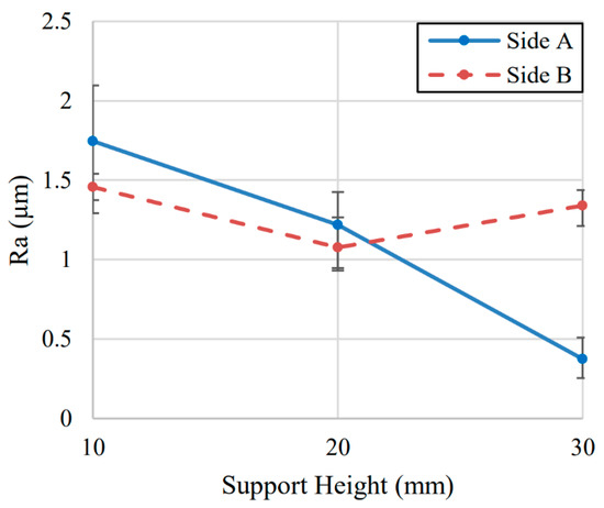 Effect of support height (H) on surface roughness measured at a height of 27 mm and centered along length of thin wall, separated by Side A and Side B of each sample.