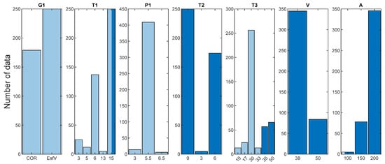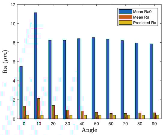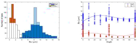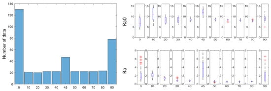 - Collect data. To obtain a good predictor system, it is necessary to provide input data to train and test the neural network. Therefore, experimental measurements have to be made, which is costly. In this case, experimental data were obtained from a historical data basis, providing 429 data for training, testing and validating the ANN. The roughness of these 429 specimens was measured, as explained in Section 2.4, before (Ra0) and after being finished (Ra). However, as can be seen in Figure 2, the number of specimens for each angle is not the same. In the same figure, it is possible to appreciate the values of Ra0 and Ra for each deposition angle.