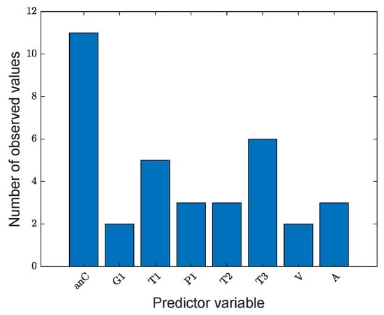 - Determine the input and output parameters. The ANN was designed to have nine input parameters: the above-mentioned two input parameters concerning specimen’s characteristics: deposition angle (anC) and as-built surface roughness (Ra0), three blasting parameters: type of abrasive particles (G1), time (T1) and pressure (P1), and three electropolishing parameters: time (T3), voltage (V) and agitation frequency (A). For some specimens, before the electropolishing process, a second blasting was performed; however, in this case, the type and the pressure were kept constant and therefore only the time was considered as an input parameter (T2), which was set to zero for specimens of no additional blasting.