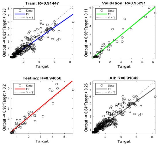- Test the system. It was found that the 9-6-10-19-1 network gave the best ANN model in predicting the value of surface roughness. Figure 5 shows the regression plot of each subset of the given dataset. A correlation factor of 0.918 was achieved when considering all data. It should be noted that the mse when considering test data was 0.22, showing that the ANN was not overfitting.