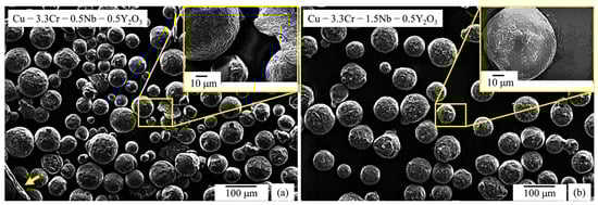 Both gas-atomized Cu-Cr-0.5Nb (Figure 2a) and Cu-Cr-1.5Nb (Figure 2b) powder materials are characterized by a predominantly spherical morphology with only few particles showing aspheric morphology. The powder particles show a smooth surface with sporadically present satellite particles attached to the powder particles.