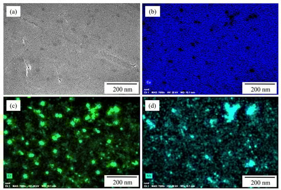 The larger particles, which are marked by yellow arrows (Figure 5b,d) have an approximate size of 100–300 nm and are found to be enriched in chromium. In contrast, the smaller nanoparticle population (red arrows) with sizes below 100 nm shows high amounts of chromium and niobium. This correlates with particle size found in L-PBF processed GRCop-84 alloy of 85–200 nm [,]. However, due to the small size of both nanoparticle species, EDS measurements were performed on sporadically found clusters of the respective nanoparticle species and therefore large amounts of copper are detected. (Table 4).