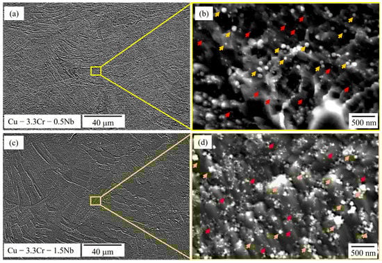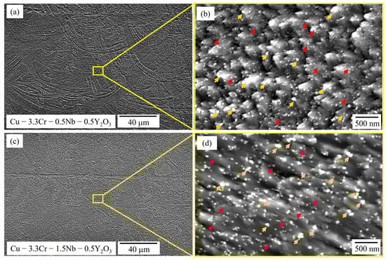 SEM images of oxide-reinforced Cu-3.3Cr-0.5Nb alloy in low (a) and high magnification (b) showing the presence of precipitates (red arrows) and dispersoids (yellow arrows). SEM images of oxide-reinforced Cu-3.3Cr-1.5Nb alloy in low (c) and high magnification (d) showing the presence of precipitates (red arrows) and dispersoids (yellow arrows).