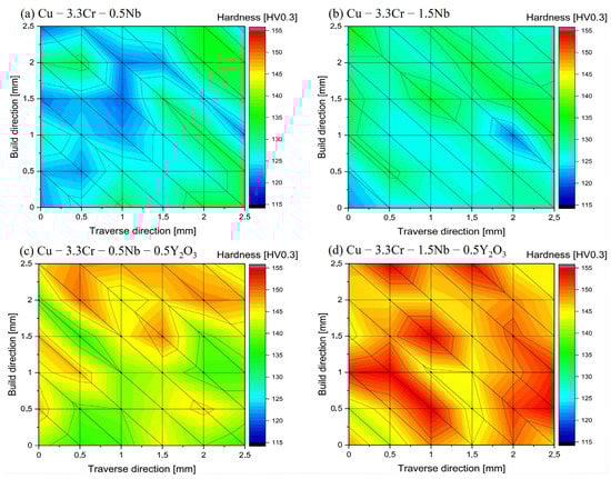 Mechanical properties of the printed oxide-reinforced materials and their unreinforced counterparts are characterized by hardness measurements. In Figure 7, representative hardness maps of printed specimens of Cu-3.3Cr-0.5Nb (Figure 7a) and Cu-3.3Cr-1.5Nb (Figure 7b) are depicted. Both materials are characterized by a relatively moderate hardness of 120–140 HV0.3. The hardness is distributed fairly homogeneous over the printed part with hardness variations up to 15 HV0.3. Oxide dispersion-strengthened Cu-3.3Cr-0.5Nb (Figure 7c) and Cu-3.3Cr-1.5Nb (Figure 7d) show considerably higher hardness compared to their unreinforced counterparts, which is in accordance with other metallic systems with dispersed oxide nanoparticles [,].