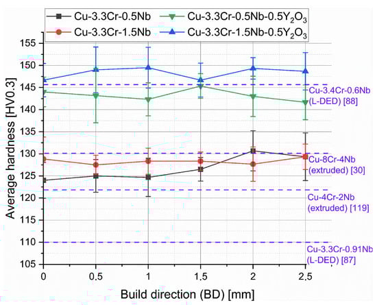 Hardness line profiles of manufactured specimen of Cu-3.3Cr-0.5Nb (black line), Cu-3.3Cr-1.5Nb (red line), Cu-3.3Cr-0.5Nb-0.5Y2O3 (green line), and Cu-3.3Cr-1.5Nb-0.5Y2O3 (blue line). Hardness values of Cu-Cr-Nb alloys manufactured by extrusion and laser directed energy deposition (L-DED) are shown in purple with their respective reference.