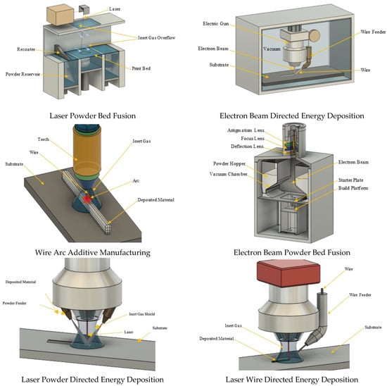 This study involves 6 different AM techniques, or processes, utilizing wire or powder feedstock. These include laser powder bed fusion (L-PBF), electron beam directed energy deposition (EB-DED), wire arc additive manufacturing (WAAM) (or Arc Wire DED), electron beam powder bed fusion (EB-PBF), laser powder directed energy deposition (LP-DED), and laser wire directed energy deposition (LW-DED). These processes are illustrated generally in Figure 1 It is observed that three processes involve wire feed, while three processes involve powder feed or a powder bed. All but the WAAM process utilize electron or laser beam energy sources. Gamon et al. [] have briefly discussed these process techniques in more detail and trade and selection is discussed in a robust paper from Gradl et al. [].