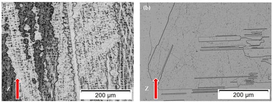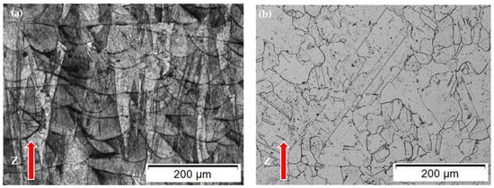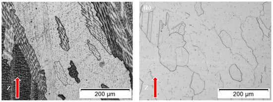 L-PBF optical microscope images: (a) as-built, (b) heat-treated.
