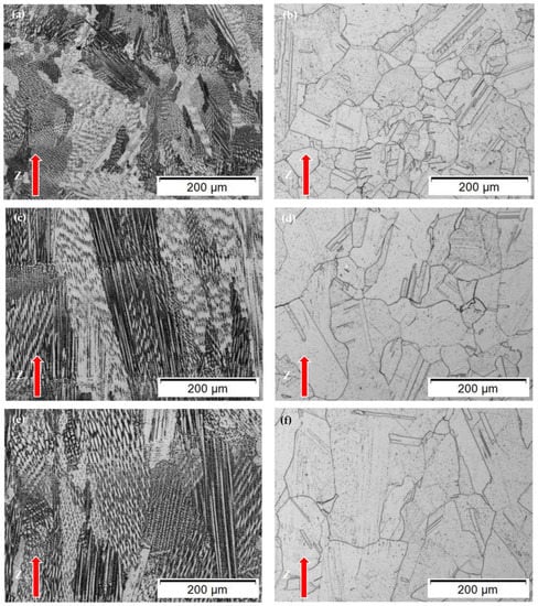 Figure 3, Figure 4, Figure 5, Figure 6, Figure 7, Figure 8 and Figure 9 show a very notable difference between the as-built AM process microstructures and those observed for post-process fully heat-treated samples. Essentially, all of the as-built AM process microstructures shown on the left in Figure 3, Figure 4, Figure 5, Figure 6, Figure 7, Figure 8 and Figure 9 exhibit columnar grains of varying lengths and widths, along with various degrees of cellular dendrites and dendritic arrays. The LP-PBF as-built microstructure in Figure 3a also shows the characteristic melt-band structure and overlapping melt pools. Figure 5a and Figure 6a show irregular grain and columnar structures containing cellular dendrites for the EB-DED and LP-DED AM processing, respectively. It is notable that Figure 6 shows the complete range of processing power from 350 W (Figure 6a) to 2620 W (Figure 6j), where only the lower-power LP-DED samples at 350 W (Figure 6a) exhibit a notable, as-built microstructure that is smaller and more irregular than the other processing power samples. Figure 7 and Figure 8 also show fairly regular columnar grains for the as-built samples, with the EB-PBF as-built columns shown in Figure 7a having a grain width averaging 15 microns. The microindentation hardness for the as-built columnar structure in Figure 7a averaged HV 191, in contrast to the as-built L-PBF microstructure in Figure 3a, where the hardness averaged HV 305, and the LW-DED microstructure in Figure 8d, where the hardness averaged HV 224.