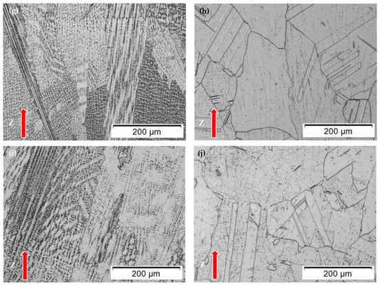 LP-DED optical microscope images: (a) 350 W as-built, (b) 350 W heat-treated, (c) 750 W as-built, (d) 750 W heat-treated, (e) 1070 W as-built, (f) 1070 W heat-treated, (g) 2000 W as-built, (h) 2000 W heat-treated, (i) 2620 W as-built, (j) 2620 W heat-treated.