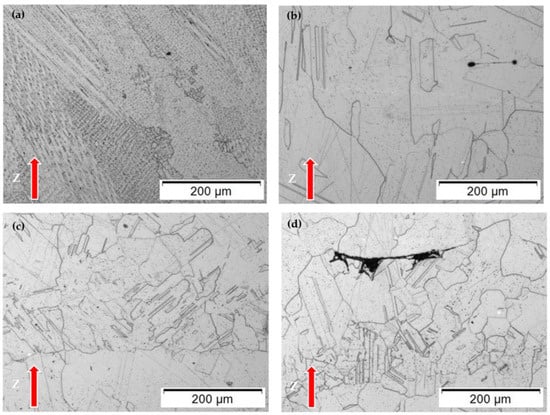LW-DED optical microscope images: (a) as-built, (b) heat-treated raster, (c) heat-treated raster 90, (d) heat-treated linear 1.