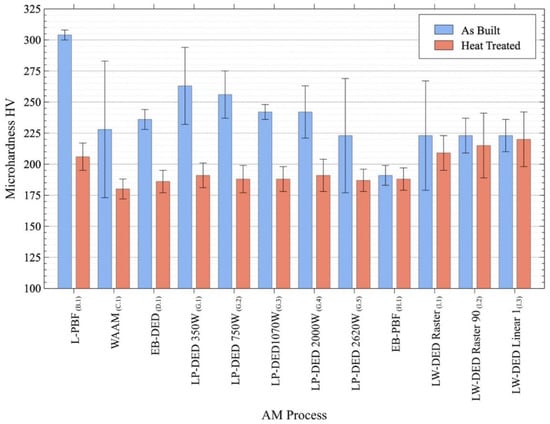 Comparison of microhardness in the as-built versus fully heat-treated (SR + HIP + SOL) condition for AM processes.
