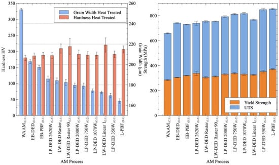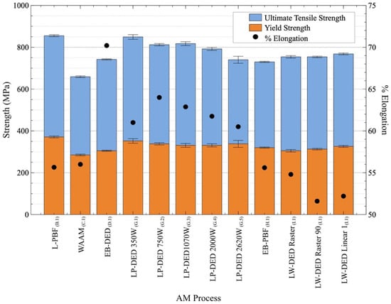 Figure 13 shows little change in the yield stress and UTS over the range of heat-treated AM process samples, with the exception of the WAAM and EB-DED products, which exhibit the largest grain widths. The EB-DED heat-treated sample also shows the largest elongation of 70.2% (Table 3). While the heat treatment of the various AM processes varied from HV 191 to HV 220 (Table 3)—a variance of 15%—the as-built variance was HV 191 to HV 304, or 59%. The corresponding as-built yield strength varied from 285 MPa for the heat-treated WAAM sample to 371 MPa for the L-PBF sample, a variance of 30% (Table 3). The corresponding elongations for the heat-treated AM process samples varied from a low of ~52% to a high of ~70%, as noted above—a variance of 35% (Table 3). These features are generally consistent with a wide window for mechanical property manipulation for the heat treatment of a variety of AM processes, as presented in Figure 2.