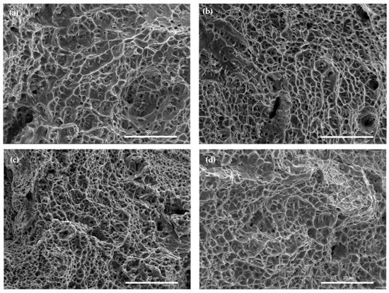 SEM images showing fracture surface features for the heat-treated, AM-processed samples generally exhibited ductile dimples having dimple sizes ranging from 2 to 5 microns. The largest dimple sizes of ~5 microns were observed for the WAAM heat-treated samples, while the smallest sizes were observed for the EB-PBF and LP-DED fractured samples. Figure 14 illustrates these ductile dimple fracture features for the LP-DED AM process heat-treated sample series, using build power levels ranging from 350 W to 2620 W. In Figure 14a, the dimple size is ~2 microns (at 350 W), while the remaining fracture dimple sizes are ~3–4 microns. These features are consistent with corresponding grain width variations and the associated yield strength, e.g., 62 microns and 354 MPa at 350 W (Figure 14a) versus 114 microns and 336 MPa at 2620 W (Figure 14e). These dimple sizes and corresponding grain sizes (widths), and yield stresses, are generally consistent with trends in a range of metal and alloy fractures where dimple size decreases with decreasing grain size and yield stress [,].
