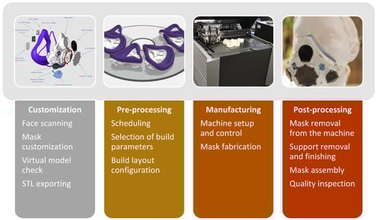 Product design features and characteristics are closely associated with the product manufacturing process. Taking especially, into account the high level of customization required to achieve the best possible fit between the mask and the user’s face, in conjunction with the requirement for the incorporation of various electronic components, AM can be considered an attractive manufacturing method. In particular, AM provides a cost-efficient and fast way to fabricate highly individualized masks based on facial scan data and user needs.
