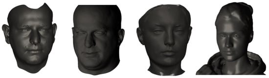 The above-described procedure has been employed for obtaining the facial geometry of three subjects, two male and one female, in an office environment (Figure 4, first three from the left). Despite the fact that the operator had little relevant experience, the whole process proved relatively straightforward and was completed quite fast, taking only a few minutes for each subject. The corresponding STL models were then transferred to the CAD workstation for customizing the mask geometry to fit the users’ facial features. At this stage, two additional STL models of female faces were used to enlarge the size and variety of the investigated sample (Figure 4, right). Virtual models are also based on real people and were acquired online under license for business and commercial use.