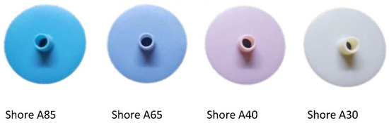 The MJ system employed for the tests is a Stratasys, Dentajet J5 polyjet printer. The corresponding process-planning software (slicer) allows the definition of basic build parameters, such as part orientation, layer resolution and layout planning of parts on the build platform, as well as the definition of more unique features such as the assignment of material per part and/or part section. A wide variety of materials with variable physical properties (stiffness, hardness, color, translucency, thermal resistance, etc.) are readily available. Furthermore, the software allows the definition of the so-called ‘digital’ materials, which are combinations of two or three base materials, permitting thereby the construction of parts with intermediate properties. An example is presented in Figure 6, which shows mask exhaust valves with various combinations of two basic materials, Agilus and Vero, so that variable rates of hardness, as measured by the corresponding shore A value, can be achieved. These variable hardness valves were then employed in mask prototypes for testing breathing comfort. Corresponding tests results showed that the optimum hardness value for the specific component is in the 30–40, shore A range.