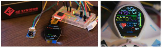 Assembly operations also include the incorporation of electronic components, namely of one humidity sensor, one temperature sensor, and the digital display, as well as the attachment of the corresponding boards and cables. Temperature and moisture sensors provide data regarding both parameters inside the mask, to assess the corresponding level of comfort. The digital display is incorporated for displaying the sensor measurements and is positioned at the center of the main body, above the filter’s adaptor. A unique round display of relatively small size (Figure 8), equipped with an IPS wide viewing angle, 240 × 240-pixel resolution and 64k RGB TFT screen, an embedded microprocessor and onboard serial 16 Mb Flash memory chip (4DSystems PixxiLCD13P) has been selected. The communication with the screen has been established via a UART port, controlled directly from an external PIC18F26K22 microcontroller. In following versions of the mask a pulse oximetry sensor will also be incorporated, implemented as reported in [87], for assessing the heart rate and oxygen saturation levels in blood of wearer.