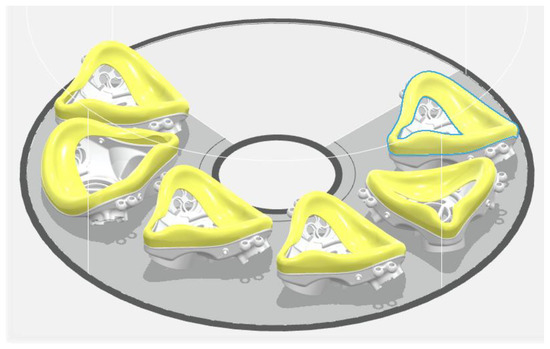 As can be seen in Table 2, a maximum of 6 masks per build job, arranged as shown in Figure 10, is possible. It is also observed that total build time stabilizes at 26 h as the number of part increases. As a result of this there is a significant decrease in build time per part as the number of parts per job increases. This can be attributed to the method of fabrication employed by the specific MJ system which involves a revolving tray separated into three concentric sections that are visited consecutively by the deposition head. Since in the mask case all three sections are visited and the total number of layers per job (defined by the maximum height of parts in a job) is the same no matter how many masks are located in the tray, no increase in total build time is observed as more parts are simultaneously fabricated.
