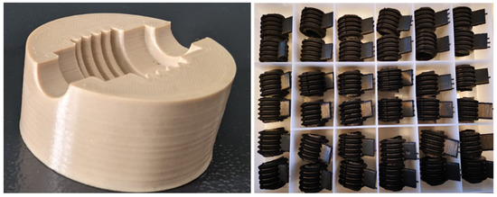The unfilled “ThermaX PEEK” from the company 3DX-Tech was examined. To examine the starting material, sample segments were cut directly from the filament. The printed samples were cubes with the dimensions 20 mm × 20 mm × 2 mm. In the first series of experiments, one cube with a build chamber temperature of 90 °C and another cube with a temperature of 150 °C were manufactured. Here, the build platform heating with a temperature of 150 °C and a nozzle velocity of 20 mm/s remained constant for both samples. The specimens were printed solid and had a layer thickness of 0.15 mm. In addition, they were manufactured on a socalled raft, i.e., a printed construction plate. Based on the results, a mold out of PEEK was then annealed and used to manufacture 100 rubber components (Figure 1).