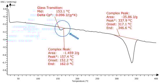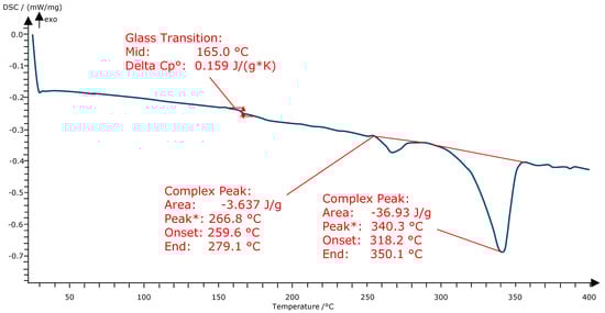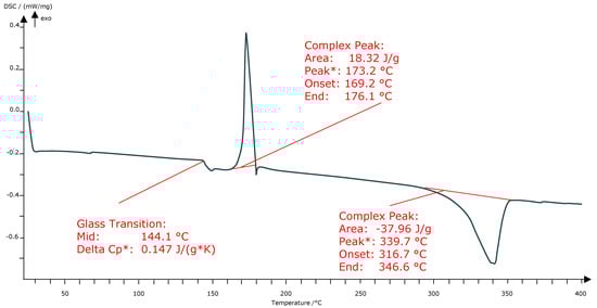 At the beginning of the process chain is the raw material, which serves as a reference point during the tests. According to the material data sheet, the glass transition temperature is 143 °C, and the processing temperature is in a range above the melting temperature. The first DSC of the material shows a deviation and opens so that the Tg from the material data sheet is lower than the determined one, at 150 °C. The degree of crystallization is at about 30%.