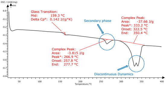 Tardif et al. also addressed the crystallization behavior of PEEK in their research work. Like other studies, PEEK was isothermally treated within a temperature range of 170–310 °C and investigated by nanocalorimetry. As described earlier in Mylläri et al. [14], secondary peaks resulting from the postannealing were determined. The broadly based test series revealed that the secondary peak is formed only at thermal aging below 250 °C. At the same time, the melting temperature of the second phase shifts with increasing temperature, and the peak temperature of the primary phase remains almost unchanged. Above 250 °C, no secondary phase could be determined [20].