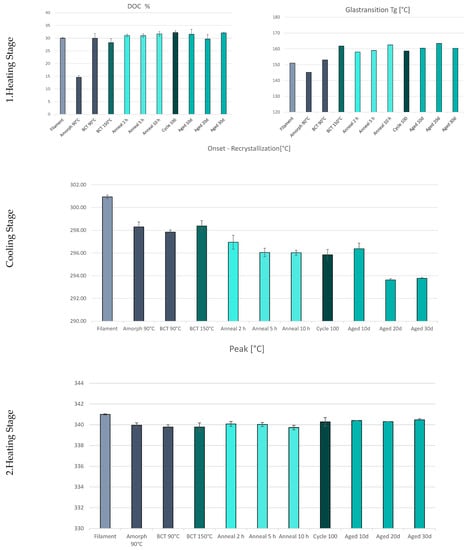 The direct comparison of the individual process stages indicates further effects of thermal aging and the findings already obtained. As already expected, the curves of the first heating stage show the increase in an increased Tg in direct connection with a high degree of crystallization and a thermal post-treatment (Figure 6). This is especially clear by comparing the original material and material with very low DOC (amorphous sample). The deletion of the material history and subsequent reheating shows that all materials subsequently exhibit almost the same morphology as well as Tg. However, it is noticeable that the onset temperature of the crystallization displays a visibly decreasing tendency when the samples are cooled. With the increased aging and thermal stress, Tk has decreased by about 6 °C (Figure 6—Cooling Stage). Two stages are indicated here. Taking the filament material as a reference, the FFF process itself causes Tk to drop by 3 °C. After the annealing process itself, there is a noticeable drop in Tk around 3 °C. According to a study by Lee et al., who found a similar phenomenon with the variation of melting temperatures, the reason could already be a degradation phenomenon or increased crosslinking [12]. In this context, there is also the degradation of the additives used, initially added to the polymers to act as nucleating agents [3,4]. However, a resulting lower crystallization ability could not be found. Although there are slight changes in Tg and Tk, the melting point of the samples does not change. All of them have their peak after the second heating at about 340 °C (Figure 6—Second Heating Stage). Therefore, there are no other indicators of aging that can be seen from the DSC analyses. A change in melting temperature would indicate a change in molecular weight. With higher molecule weight, the melting temperature would increase. Degradation processes could increase the low molecular weight fraction, which would decrease the melting temperature. According to [13], the previously described double peak phenomenon in the melting range is still largely unexplained; only a connection to the morphology is suspected as Wang et al. found out [23].