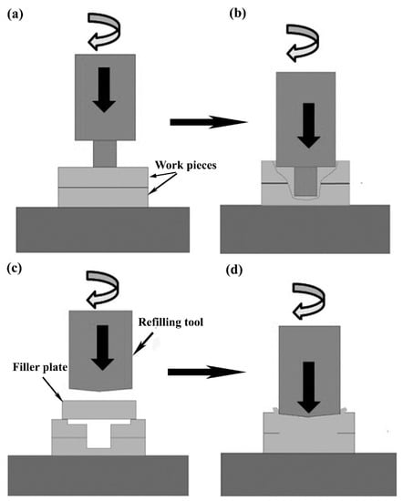 - Chai, P.; Hu, W.; Ji, S.; Ai, X.; Lv, Z.; Song, Q. Refill Friction Stir Spot Welding Dissimilar Al/Mg Alloys. J. Mater. Eng. Perform. 2019, 28, 6174–6181. [Google Scholar] [CrossRef]