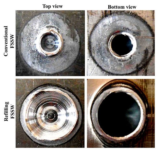 - Venukumar, S.; Yalagi, S.; Muthukumaran, S. Comparison of microstructure and mechanical properties of conventional and refilled friction stir spot welds in AA 6061-T6 using filler plate. Trans. Nonferrous Met. Soc. China. 2013, 23, 2833–2842. [Google Scholar] [CrossRef]