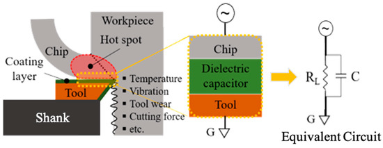 To improve the limitations of the methods mentioned above, this study proposes a novel approach to monitor the interface cutting temperature while machining is in process. The monitoring model of in-process machining is based on the impedance characteristics of the cutting tool with a dielectric coating layer. Dielectric coating on on the surface of quality cutting tools is up to tens of microns thick and prolongs the lifespan of the cutting tool by preventing wear, diffusion, oxidation, and thermal shock. The cutting tools are coated with dielectric coating materials such as diamond, ceramics, and cubic boron nitride (CBN) to enhance the ability of the cutting tool, and broaden workpiece material choices and cutting parameters [26,27]. The dielectric coating materials used in cutting tools have high impedance characteristics and are therefore often used in high-output batteries and capacitors [28]. This study utilizes the dielectric impedance formed by the cutting tool in contact with a workpiece during the machining process. In specific terms, the change in relative permittivity of the dielectric material varies with temperature which is the main concept for this proposed method. Hence, in-process monitoring of a cutting process is feasible by analyzing the impedance responses of the dielectric layer. In other words, the cutting process at the local TCI region may be analyzed in real time with the proposed cutting temperature monitoring method based on the impedance response.