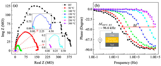 Capacitance under given temperature conditions can be estimated from the obtained Nyquist diagram where the capacitance is the inverse of the product of natural frequency and the real part of impedance. As shown in Table 1, although the estimated capacitance increased slightly from when at room temperature, the variance among given temperatures was minimal considering the capacitance effect. The capacitance was steady enough within the variation range of 5.8 pF under 300 °C. Therefore, capacitance was negligible and assumed to be constant in the equivalent circuit model; and only the real part of impedance, which is the leakage resistance as described in Figure 1, is considered for the study.