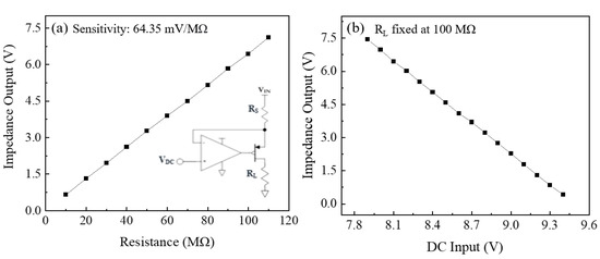 A voltage-controlled current source (VCCS) was designed and implemented to monitor the impedance output with changes in temperature at the TCI. Due to the high impedance in the dielectric layer as previously seen from impedance spectroscopy results, a high impedance op-amp was used for building the VCCS. As shown in Figure 4a, the VCCS consists of the operational amplifier and P-channel MOSFET to ensure constant current flows through the system. The output voltage linearly increased as load resistance, RL, increased—implying that the voltage is adequately controlled to provide constant current flow. The sensitivity with current setup used throughout the experiment was 64 mV/MΩ and the amplifier measured up to 150 MΩ. The amount of constant current flow can be controlled by adjusting the input voltage (VDC) at the op-amp as shown in Figure 4b. When the RL was fixed by controlling VDC, impedance output could be adjusted, which itself indicates the amount of current was properly controlled. Depending on systems and machining conditions, the measuring range can also be changed by adjusting the shunt resistor, RS, or VDC of the VCCS. From the experiment on the implemented VCCS, since the RL represents impedance at TCI, change in impedance at TCI could be monitored as RL changed, as output voltage measurement.