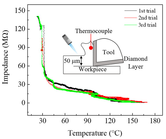 Impedance of the dielectric layer under temperature variation was analyzed at the interface by placing the cutting tool in 50 μm contact with an aluminum (AL) workpiece while the AL was being gradually heated. A thermocouple (TC) was attached to the top surface of the cutting tool near to where the contact was made for impedance comparison with temperature. The impedance response from VCCS and temperature from TC were measured simultaneously using a data acquisition device, and impedance was measured at RL in VCCS. Similar to the previous spectroscopy experiment result, TCI impedance showed an exponentially decreasing trend as temperature increased, as shown in Figure 5. Until temperature reached 40 °C, the impedance of 140 MΩ at RT dramatically decreased to 30 MΩ. After temperature exceeded 40 °C, changes in impedance showed an almost linear relationship with temperature variation. For repeatability, 3 trials of experiment were performed and all the results showed identical trends without showing any random response in impedance under the elevated temperature conditions. Therefore, from the thermal experiment, it is observed that the proposed impedance-based in-process cutting temperature monitoring method can be implemented into machining systems to monitor the TCI cutting temperature by measuring interface cutting temperature. This is achieved by directly probing the cutting tool in a workpiece.