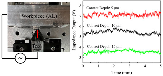 To see the stability of impedance output, the experimental setup was constructed as shown in Figure 6. Contact depth of the cutting tool with AL was adjusted using manual stage; 5, 10, and 15 μm contact depths were tested while collecting impedance output from VCCS for 5 min. Outputs on all three cases were stable enough to monitor the cutting temperature and steady under corresponding contact depth. Additionally, no remarkable signal noise was detected other than some variations due to instable contact. Impedance was sensitive to not only temperature, but the contact area as shown in stability test results. The more contact made, the less impedance output was shown. Thus, it is expected that the proposed mechanism can also be utilized in the machining process monitoring method that precisely and accurately monitors vibration, chatters, or cutting force occurring in the interface.