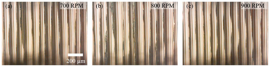 Microscope image of machined surface: (a) 700 rpm, (b) 800 rpm, and (c) 900 rpm.