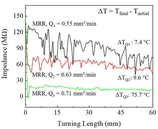 Each machining condition showed different temperature profiles with the proposed in-process interface cutting temperature monitoring method, as shown in Figure 9. Impedance is inversely proportional to cutting temperature, which is predicted from the impedance spectroscopy result and thermal characterization. Thus, a drop in impedance implies a decrease in temperature. When machining with the lowest rpm condition corresponding to the material removal rate (MRR, denoted Q here) of 0.55 mm3/min, impedance gradually decreased as more material was removed from the workpiece. However, when cutting the workpiece with the highest rpm condition that had MRR of 0.71 mm3/min, the impedance rapidly dropped and saturated after cutting 30 mm. From the three given conditions, ΔT (which is the difference between the initial temperature and the temperature after machining 60 mm) was estimated to be 7.4, 9.6, and 75.7 °C at 700, 800, and 900 rpm, respectively. As more material is removed, the impedance decreases. In other words, cutting temperature increases when removing more material. Considering the difference in each of the machining conditions, the result showed that the proposed in-process machining monitoring method at TCI could monitor the cutting temperature and even capture minor differences in interface cutting temperature. Therefore, the method may be applied to conventional machine tools to monitor the machining process in a precise and accurate manner.