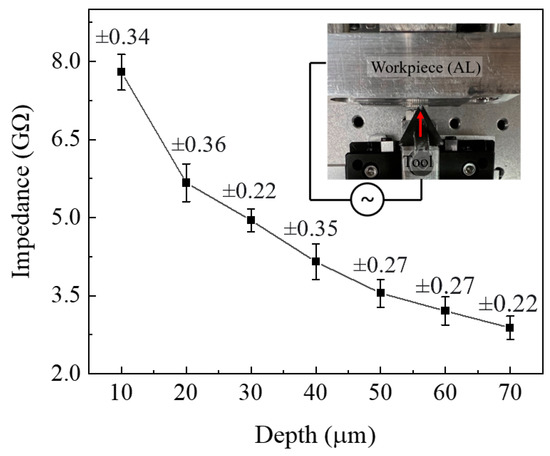 The contact area of the cutting tool and workpiece during the machining process is another major factor in impedance response. As the contact area increases, the impedance of the dielectric coating layer decreases, as could be predicted from the stability test. The characterization of this effect was analyzed by measuring the impedance when the cutting tool is touching the AL workpiece. Similar to the stability test, the contact area was controlled by depth of the tool into the AL workpiece. It is evident from Figure 10 that impedance is also inversely proportional to the contact area at TCI. As the depth of contact increased, the impedance decreased from 7.8 to 2.8 GΩ. This study is mainly focused on measuring the cutting temperature; however, the impedance is not only sensitive to temperature but also to the contact area. Therefore, it is expected that, with the proposed method, other machining processes such as chatter, vibration, and cutting force can be monitored while machining is in process. Additionally, the indentation process is one possible application that can be developed with the proposed method to measure material properties during the machining process. Also, the depth of the indentation process can be precisely estimated, and uniform patterns can be fabricated by monitoring the impedance feedback signal.
