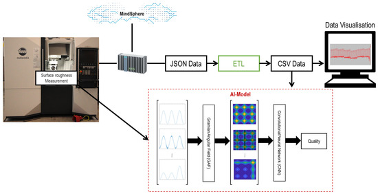 Figure 1 indicates the integration of the whole data acquisition system into the utilized milling machine. A five axes CNC machine tool (Haas-Multigrind® CA, Trossingen, Germany) with a Siemens Sinumerik controller used in this study. For the data acquisition, the machine tool is equipped with a so-called Siemens SINUMERIK EDGE (SE) Box. Siemens CNC controls supply data, and SE, making it possible to record data and states of the control in a resolution of 1 ms (1kHz) parallel to the process. The SE box is, in principle, an industrial computer and has the corresponding resources to store the data. The MindSphere Capture4Analysis application enables the selection of the signals to be recorded and the trigger time from which a signal is to be recorded. According to a defined system, the data is written to a JSON file on the hard disk of the SE box with the execution of the NC program. Further, the JSON File for each test is processed through a written ETL program (extract–transform–load) to obtain the tabular data in CSV format. The CSV data and post-process information from the measurement system collected in tabular data are imported directly into an artificial intelligence (AI) Model. Moreover, the CSV data can also be visualized using an external computer for the machine tool user.