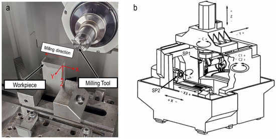 Figure 2a illustrates the experimental setup. The milling tool moved from the right side to the left side of the workpiece (according to the milling direction shown in Figure 2a), and for the creation of slots with a depth of 6 mm, six slot milling passes each with axial depth of cut, ap, of 1 mm were conducted. The signals from different axes of the machine tool were recorded through the SE Box system and saved as a JSON file. Figure 2b illustrates the different axes in the HAAS machine tool. The types of signals that the Edge Box for the main spindle and each axis can record are categorized into current, load, torque and power, and are described in section results and discussions. At each milling pass, the Edge Box started to automatically record the signals slightly prior to the slot milling process and the recording was automatically stopped after the cutting process.