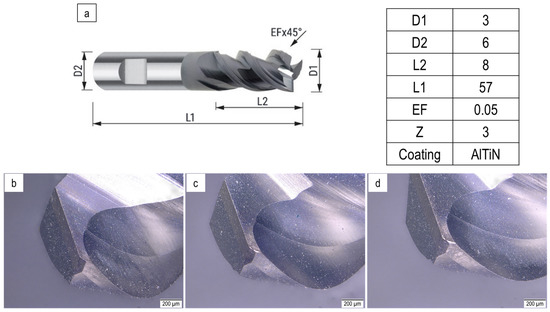 Figure 3a shows the geometrical properties of the utilized tools. The milling tools were coated with AlTiN. D1, D2, L1, L2, EF and Z are cutting tool and shank diameter, total length, cutting edge length, corner chamfer and the number of teeth, respectively. Figure 3b–d also demonstrated three cutting edges of a new tool.