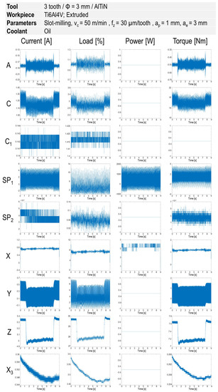 Signals of current, load, power, and torque from different axes and spindle in the slot milling at vc = 50 m/min and fz = 30 µm/tooth.